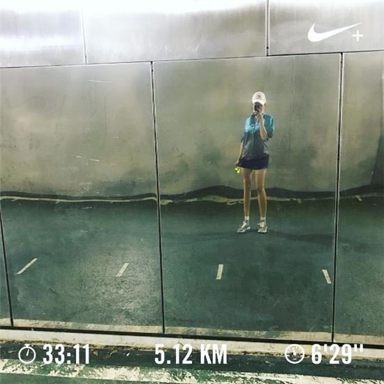 이시영은 28일 자신의 SNS에 "마라톤 끝나고 나니 기록이 훨씬 좋아짐. 몸이 점점 더 가벼워지구 있어요ㅎㅎㅎ 런스타그램 내가 가면 길이 된다. 화이팅..이제 7개월. 윤이화이팅"이라는 글과 더불어 한 장의 사진을 게재했다. 먼개소리야