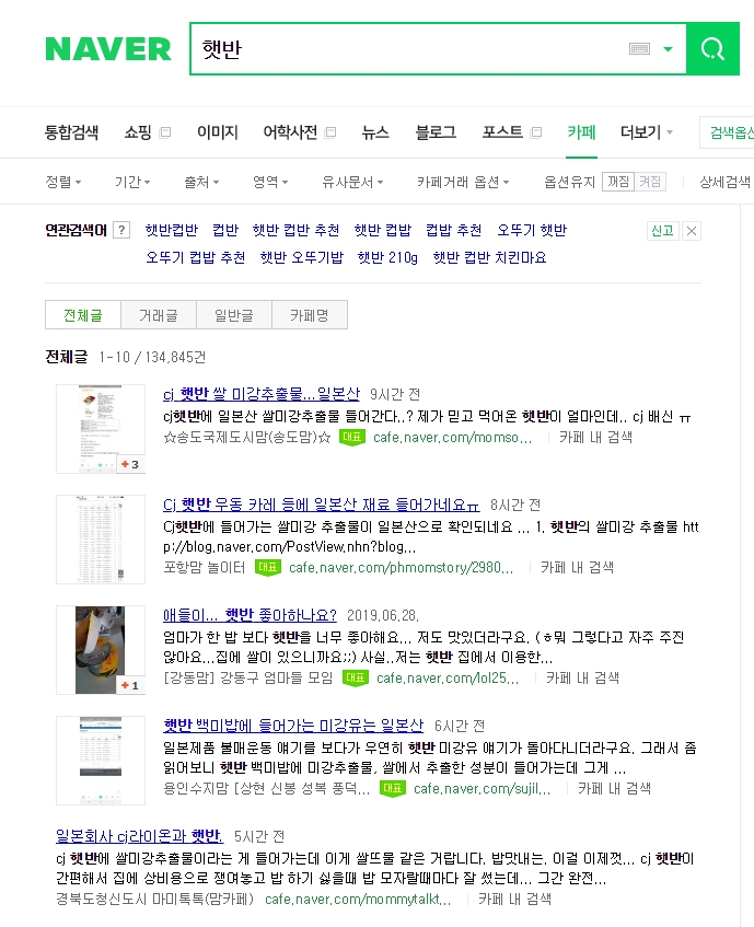 네이버에 햇반 검색하고 카페 누르니까 이렇게 뜨네요 소식이 빠르게 퍼지고 있는 거 같네요