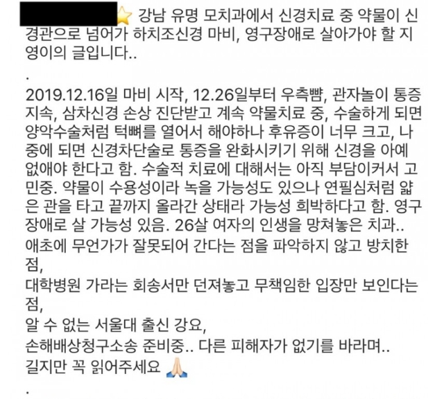 해당 치과에서 치료를 받은 시민 A 씨는 최근 자신의 SNS에 “강남 유명 모치과에서 신경 치료 중 약물이 신경관으로 넘어가 하치조신경 마비, 영구장애로 살아가야 할 처지다”라는 글을 게재했다.