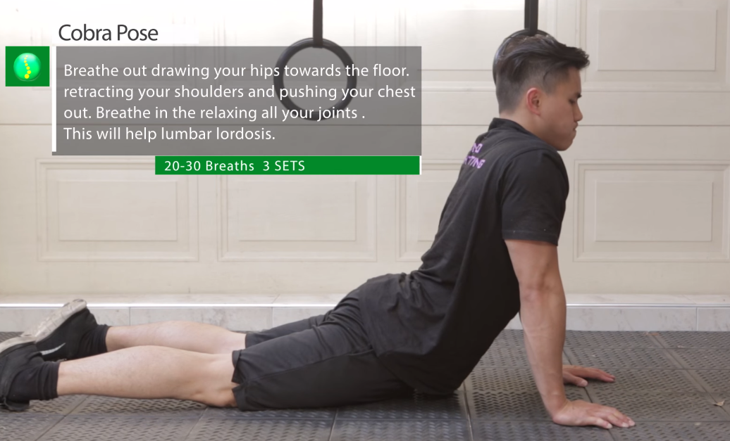 엎드린 후 손으로 땅을 짚고 최대한 상체를 올려주는 척추 교정법이다. 시선은 정면을 바라봐야한다. 1일 20~30회 3세트를 해주는 것이 좋다.