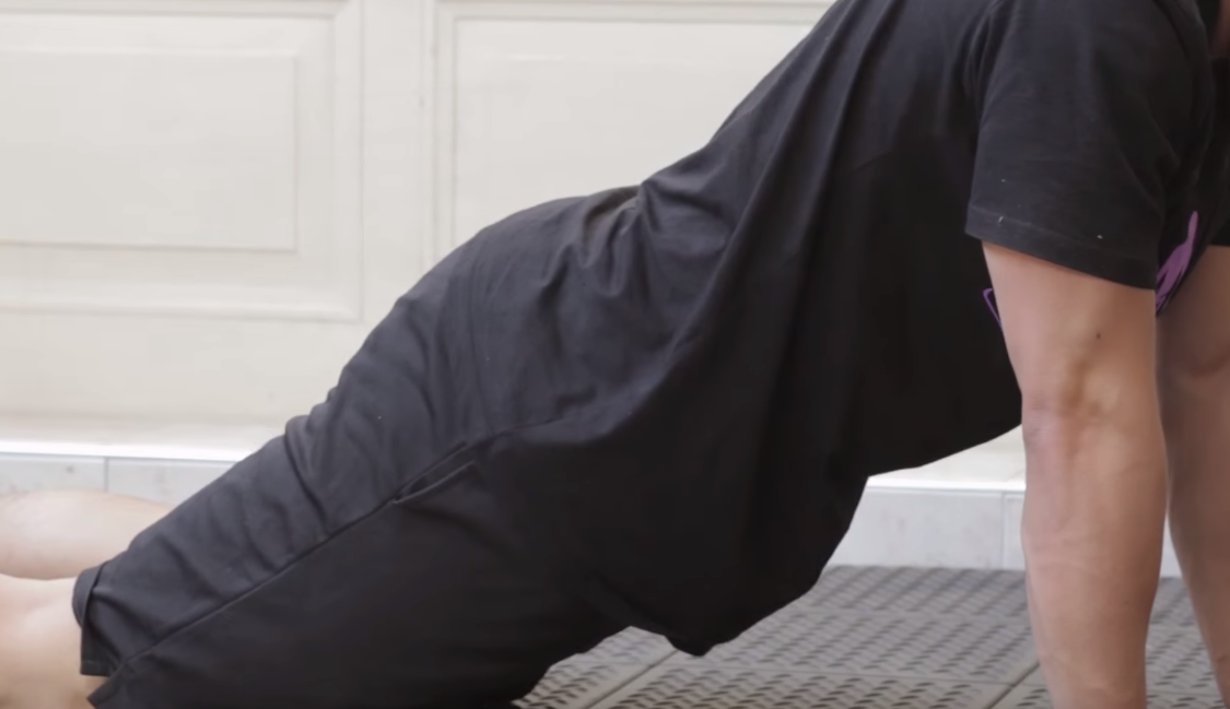 땅에 손을 짚고 무릎을 구부려 허리에 굴곡이 생기게 한다. 이후 숨을 내쉬며 허리를 위로 올려준다.