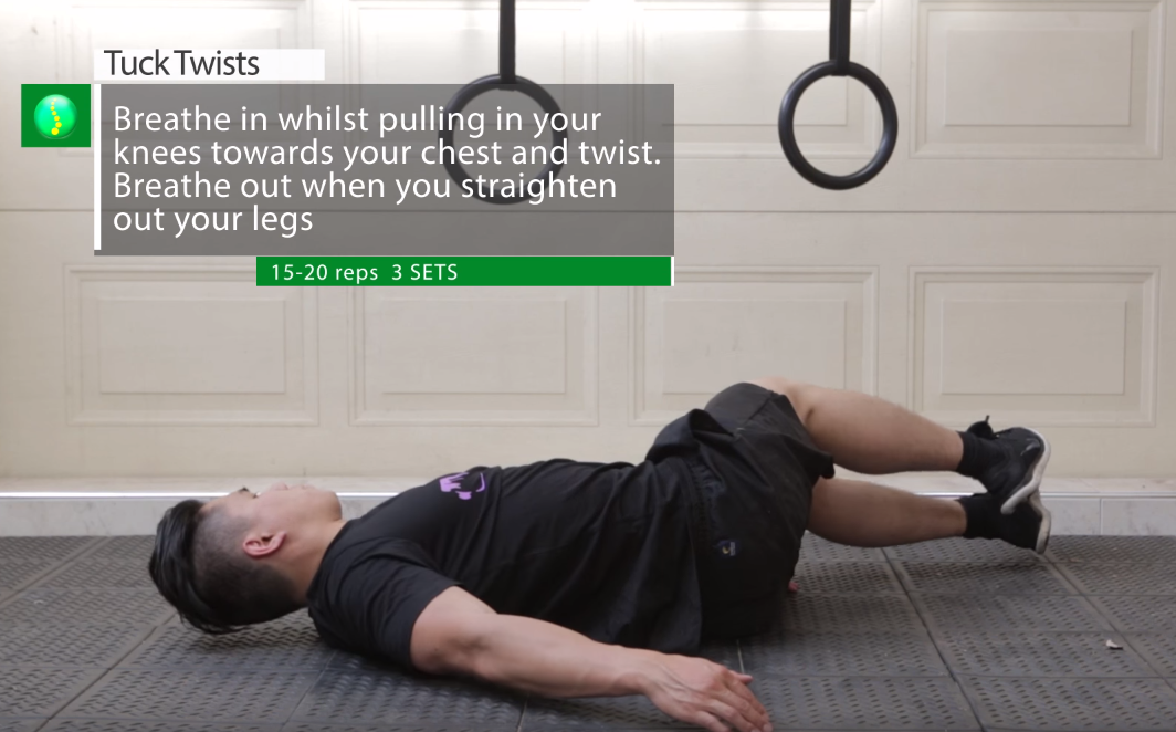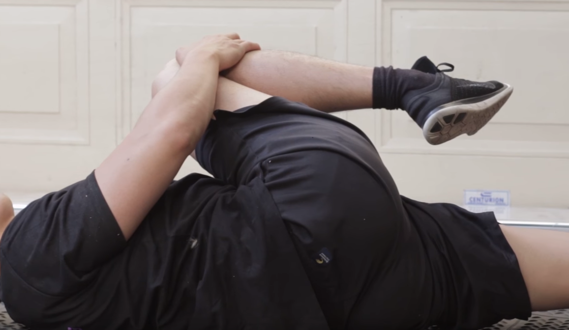 정자세로 누운 후 다리를 번갈아가며 무릎을 가슴까지 올려준다. 그리고 오른쪽 무릎은 왼쪽으로, 왼쪽 무릎은 오른쪽으로 구부려준다.