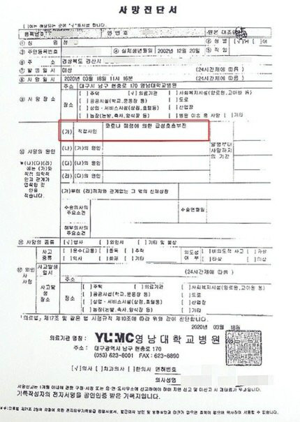 1. 사망 시점에서 확인할 수 없는 내용은 사망진단서에 적어서는 안 됨. 사망자는 사망 당시 코로나 확진을 받은 상태가 아니었으므로 저렇게 기술하는 건 이세계로 전이되서 마왕과 싸우다가 독에 당해 사망이라고 쓴거나 다른 게 없는 수준임.