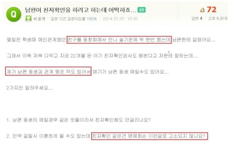지난 2014년 7월 네이버 지식인에는 “남편이 친자확인을 하려고 하는데 어떡하죠”라는 한 여성의 질문글이 올라왔다.