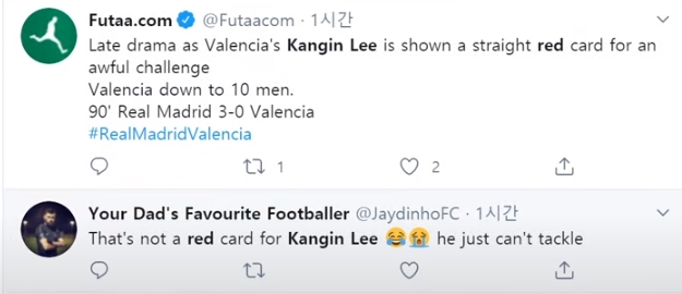 또 다른 유저는 “이강인이 왜 레드카드냐. 걘 태클 못한다”라고 비꼬기도 했다.