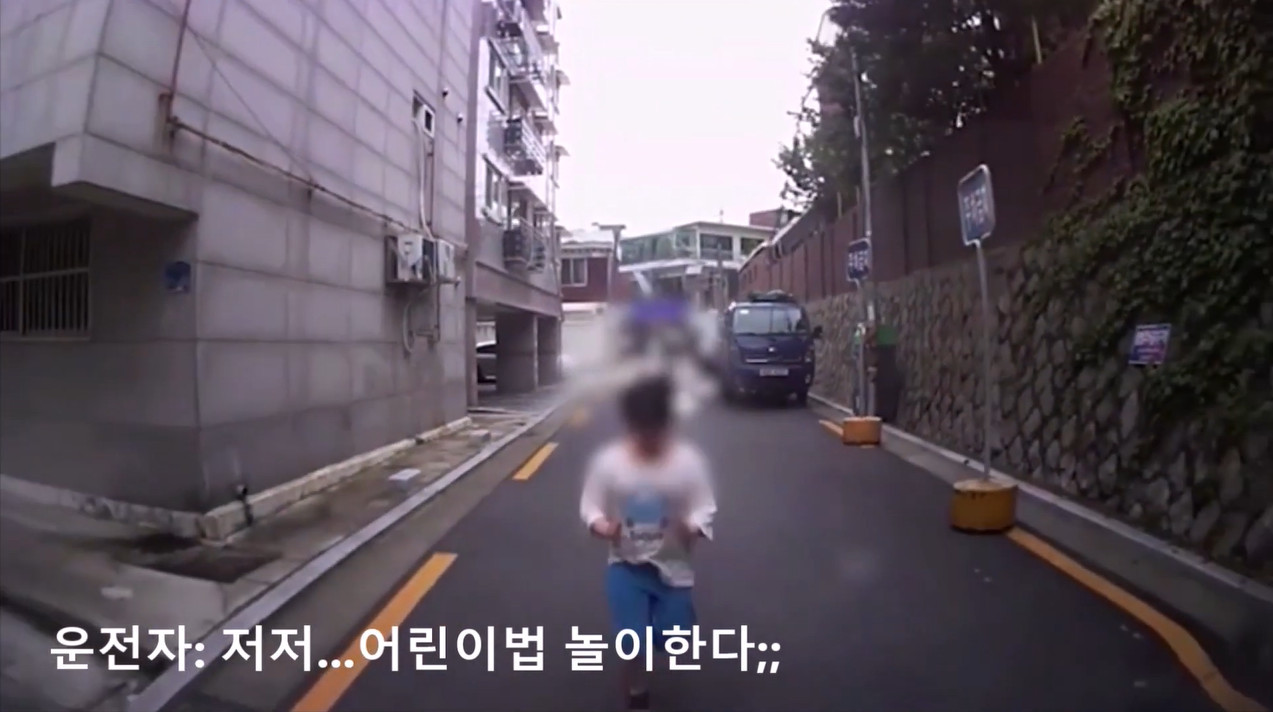 영상 속 등장하는 어린아이는 빌라 주차장에 대기하고 있다가 차가 지나가는 순간 무작정 차로 돌진했으며 도로 바닥에는 스쿨존 표시가 새겨져 있었다.