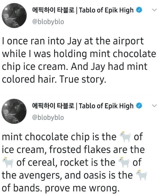 그러자 타블로는 자신의 트위터에 “저번에 공항에서 민초 아이스크림 먹다가 박재범 만난 적 있다”라며 “그때 박재범 헤어 컬러가 민트색이었다. 실화다”라며 저격했다.