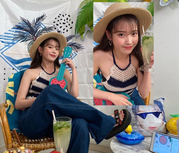 공개된 사진 속 아이유는 밀짚모자를 쓰고 장난감 기타를 든 모습이다. 그는 나무 의자에 앉아 모히또를 마시며 바캉스 분위기를 냈다.