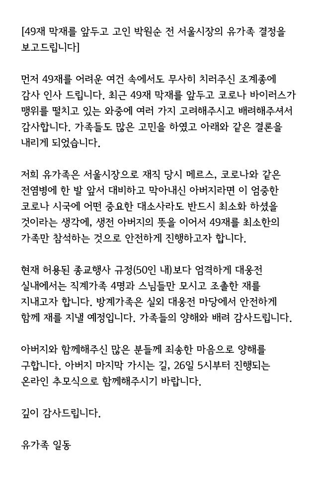 박시장님 유가족 인사, "49재를 앞두고 인사드립니다." 본문