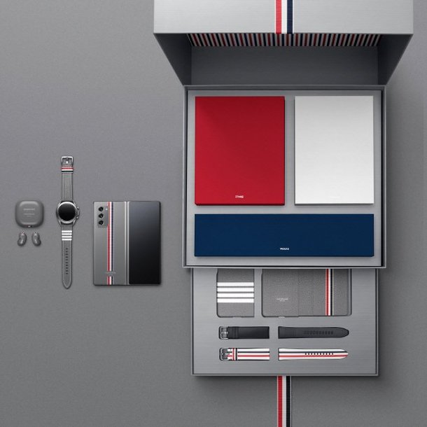 ‘갤럭시 Z 폴드2 톰브라운 에디션’ 패키지는 ‘갤럭시 Z 폴드2’뿐 아니라 톰브라운의 상징적인 디자인 요소가 가미된 ‘갤럭시 워치3’ 41mm 모델, ‘갤럭시 버즈 라이브’가 포함된다. 이와 함께 2종의 폴더블폰 가죽 케이스와 2종의 ‘갤럭시 워치3’ 스트랩 등 다양한 액세서리도 제공하며, 충전기, 케이블, 더스트 백 등 내부 구성품까지 톰브라운의 디자인을 적용해 오래도록 소장하고 싶은 패키지 디자인을 완성했다.