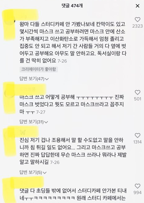 대부분 이용자들은 스터디 카페 내에서 마스크를 쓰는 것에 불만을 드러냈다.