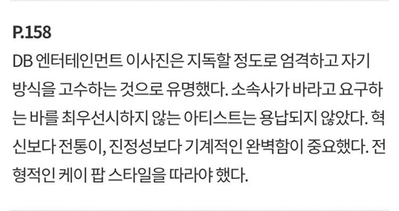 책의 48페이지에는 “재능만 있어서는 안 된다는 사실은 모두가 알고 있었다. 그렇기 때문에 연습생들은 절박한 심정으로 모든 노력을 쏟아부으며 노 대표와 다른 이사진의 눈에 띄려고 했다”며 “연습생들은 예외 없이 삼십 일마다 강당에 모여 이사진에게 월말평가를 받는다”라고 쓰여있다.