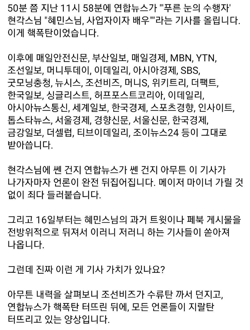 고일석 페북 “혜민스님 폭탄 누가 터트렸나” 본문